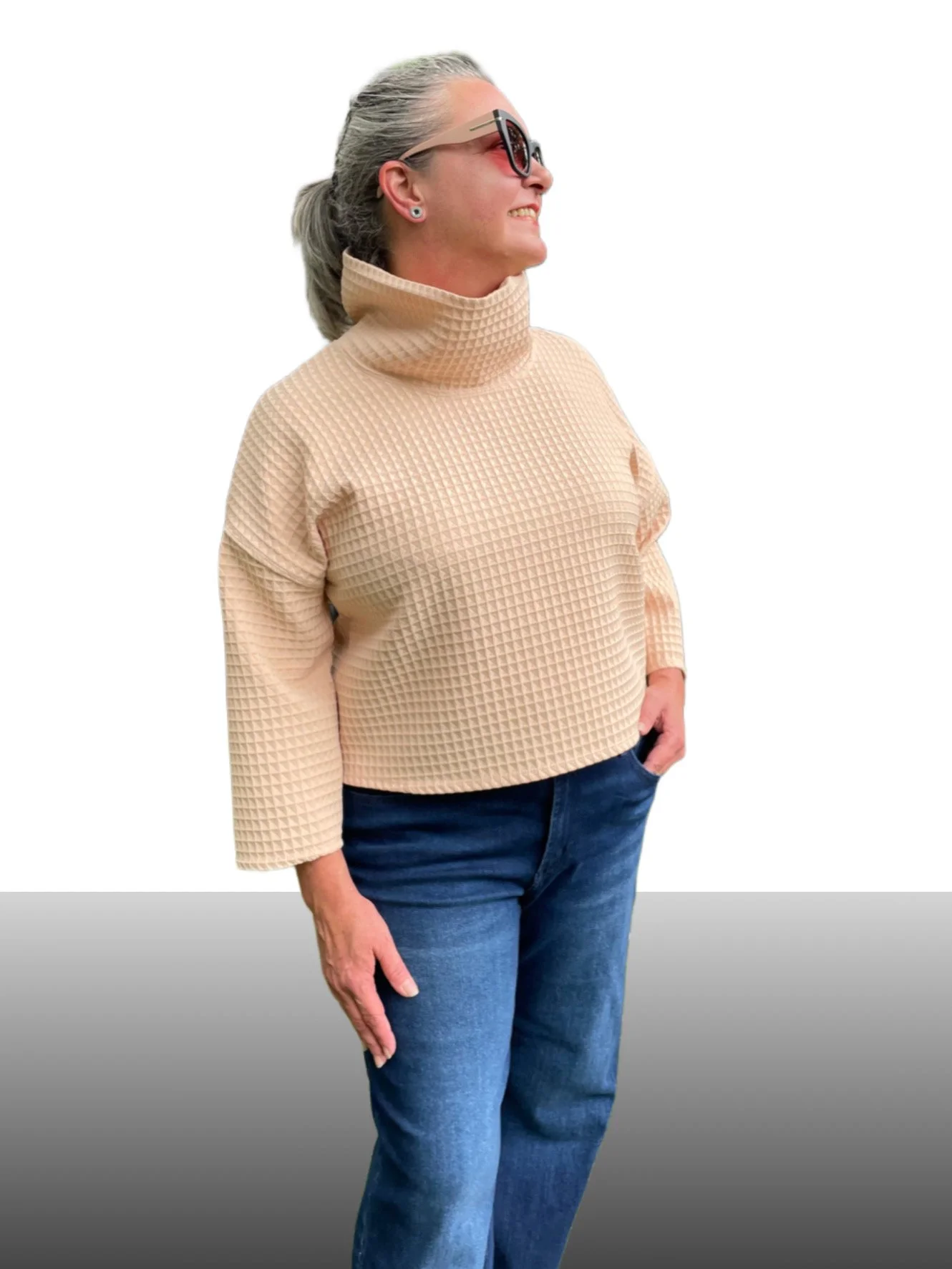 Fabulous material in lovely color. One Size top with loose cowl neck. Can tuck it in pants, wear it as an extra layer, or keep it simple as per pic :)